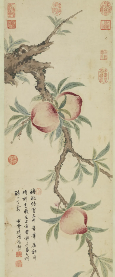 中国人的新年祈愿,还包括长寿康健,此希冀深深凝注于蟠桃这一吉瑞象征之中。与王维烈同时代的嘉兴文人画家项圣谟,其《蟠桃图轴》以淡墨轻彩写就仙果,笔墨挥洒间让遥不可及的千年仙寿,化作纸素间可触的清赏。立轴左侧,项圣谟挥毫题写“蟠桃结实三千岁,笔底能开顷刻花。我在上方曾吃过,至今犹醉一天霞”的行书绝句,更将福寿绵长的浪漫逸想融入文人的清隽情怀,令观者见桃实而思长寿,品诗句而醉烟霞。