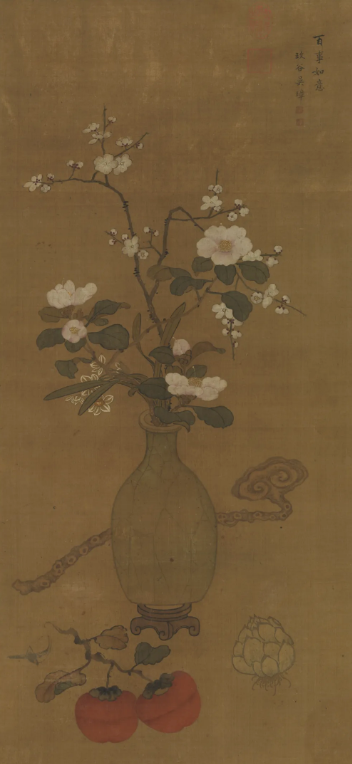 蟠桃以千年之实寄寓生命丰美,红柿则以丹红之姿承载吉祥圆满。明清文人画家多有绘柿之作,常将双柿与如意同帧并置,以添“事事如意”“好事成双”的圆满和谐之喜。清代画家吴璋的《百事如意轴》,敷彩古淡,于尺幅间绘就一派清和之境。画面中间,青瓷花瓶釉色温润,端置于浅足几架之上。瓶中折枝错落,白梅疏枝缀雪,蕊心浅黄点染,瓣瓣轻匀如缟。山茶素瓣含蕊,柔叶苍润相衬。瓶下丹柿双垂,丰腴饱满,恰是成熟最盛之态。旁侧如意蜷曲有致,线条柔婉,与丹柿两两相望。此作尽得工笔院体的谨严细腻,丹柿之艳、花枝之雅、如意之柔融于画面,使人目及红柿便盼事事顺遂,赏尽花姿更觉清吉相伴。