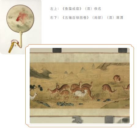 除却根植于田园清趣的草木蔬果,妍丽多姿的金鱼与灵鹿,亦是新春吉庆绘画经典题材。清代《鱼藻成扇》与《五福百禄图卷》,均借谐音寄意,为画面注入别样生机与祥瑞气息。金鱼悠游碧波,承载“金玉满堂”“富贵有余”的富庶期望;灵鹿呦鸣林泉,蝙蝠凌空飞翔,寄寓“官禄亨通”“福禄满堂”的五福之祥。